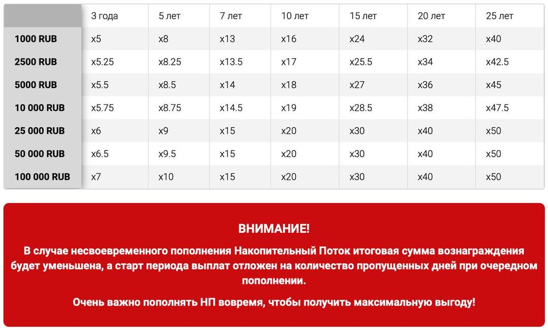 Сумма вознаграждения в Накопительный Поток зависит от периода накопления и суммы создания потока: чем больше и то и другое, тем больше приумножение средств: